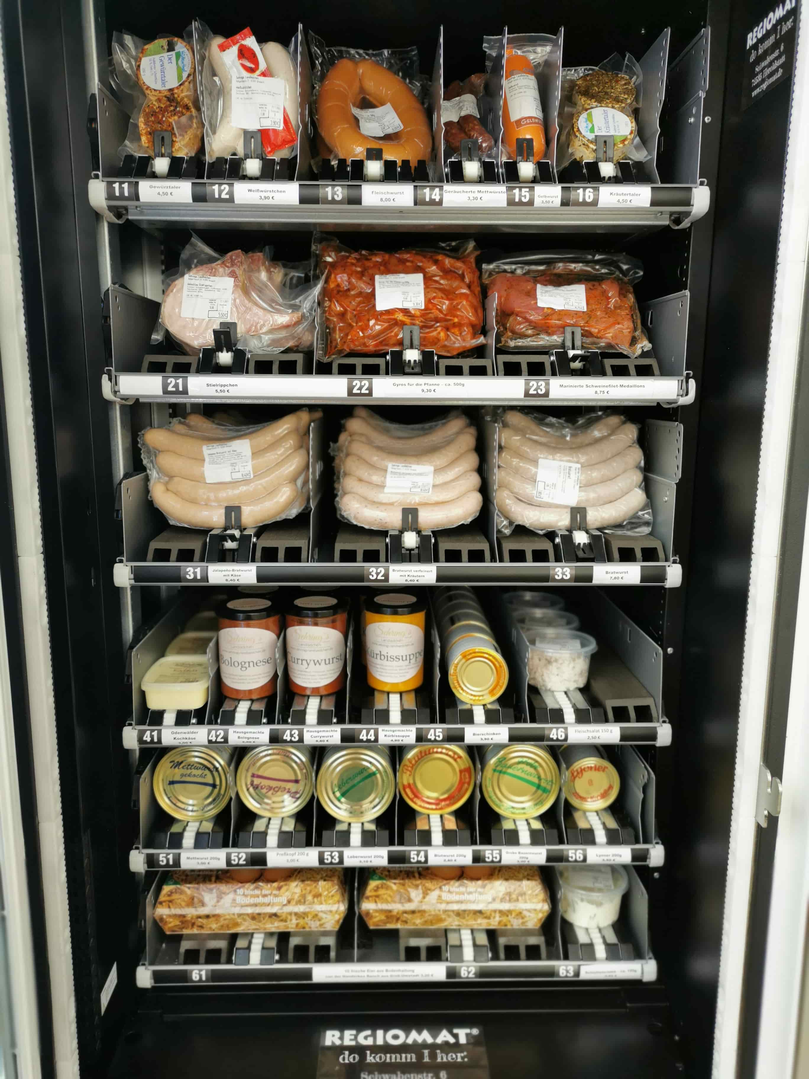 In unserem Regiomaten finden Sie Hausmacher Dosenwurst, Fleischwurst, drei verschiedene Sorten Bratwürste, Rindswürste, Gelbwurst und weitere Sorten Wurst, sowie Eier aus Bodenhaltung und verschiedene Salate! Unser Sortiment wechselt je nach Saison. Passend zum Grillwetter gibt es unsere mageren oder durchwachsenen Steaks zu kaufen. Für die kälteren Monate gibt es unsere Stiel- und Kammrippchen und Sauerkraut (500g Beutel). Hier ist für jeden etwas dabei.